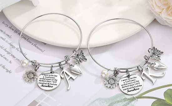 One of the coolest, on trend bracelets for teenage girls today is the sunflower charm bracelet design. Charm bracelets have been famous ever since and are one of the accessories that never go out of style. Particularly for teenage girls, wearing a perfect charm bracelet is always pretty to look at. The features of this charm bracelet come with a sunflower, a butterfly, a pearl, a heart, and a beautiful message engraved on the circular charm. On top of that, the bracelet is expandable. This means anyone can comfortably wear it. Additionally, the initials can be customized as per order requests. You certainly have the liberty to choose the letter that you want to be engraved.